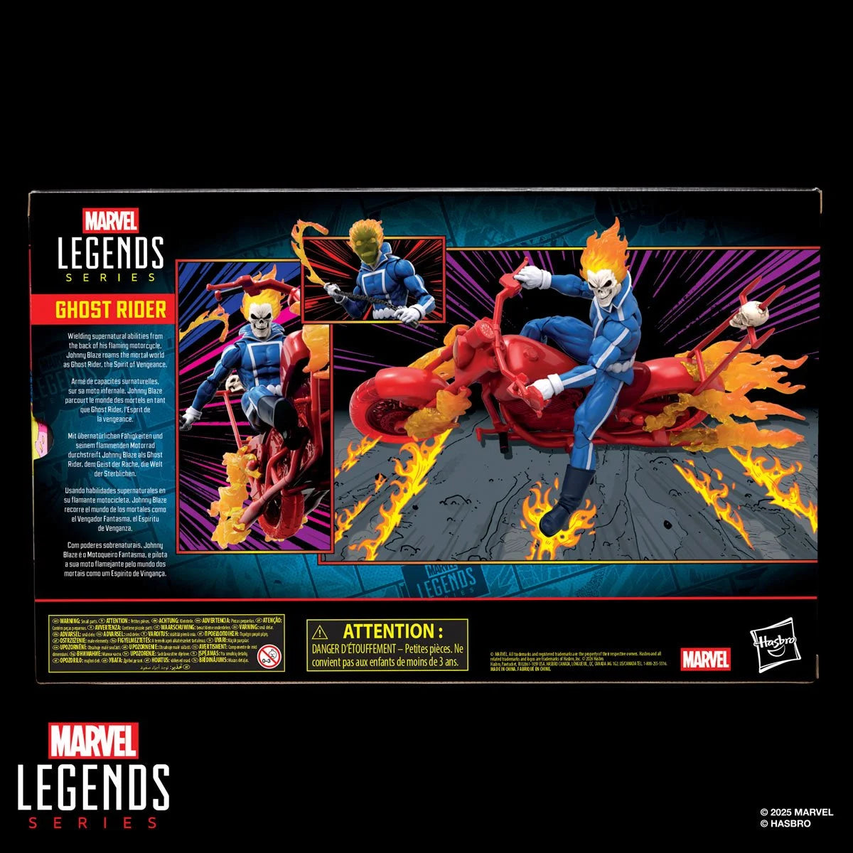 The iconic Johnny Blaze rides into Marvel Legends collections as Ghost Rider on his fiery motorcycle.