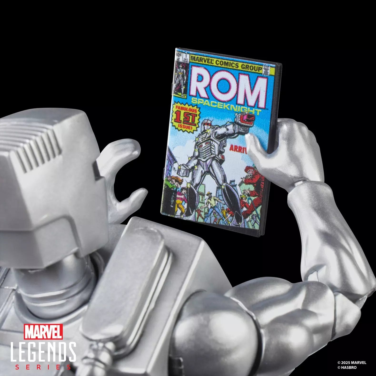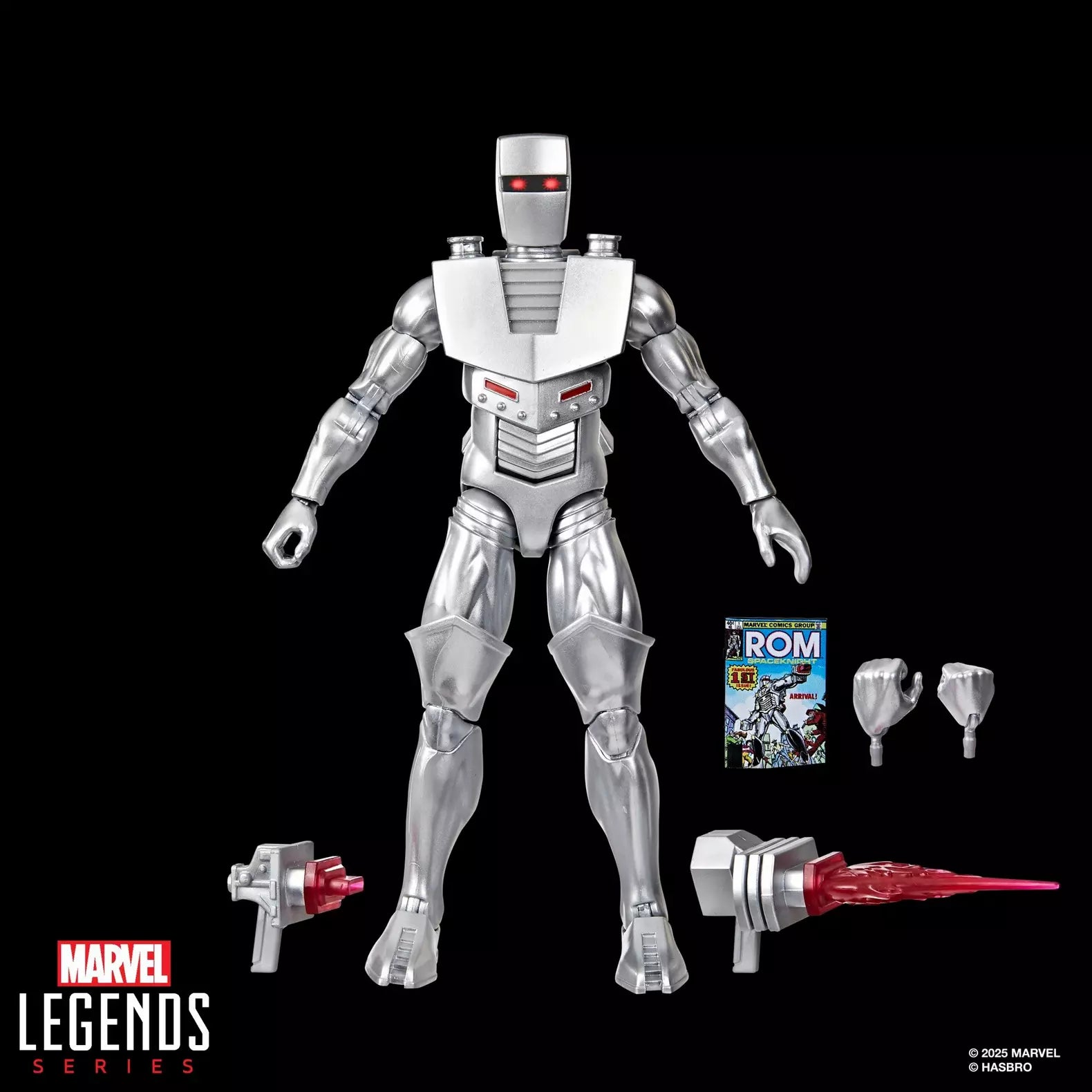 Detailed to look like the character’s appearance in Marvel's Rom: Spaceknight #1 (1979), this collectible 6-inch scale Marvel figure is fully articulated with premium design and poseable head, arms, and legs. This Marvel action figure set comes with 6 accessories, including blast effect, alternate hands, Analyzer to reveal shape-shifting Dire Wraiths, and Neutralizer to banish them into Limbo, as well as a 6-inch scale plastic comic book accessory featuring the cover of Rom: Spaceknight #1 (1979).