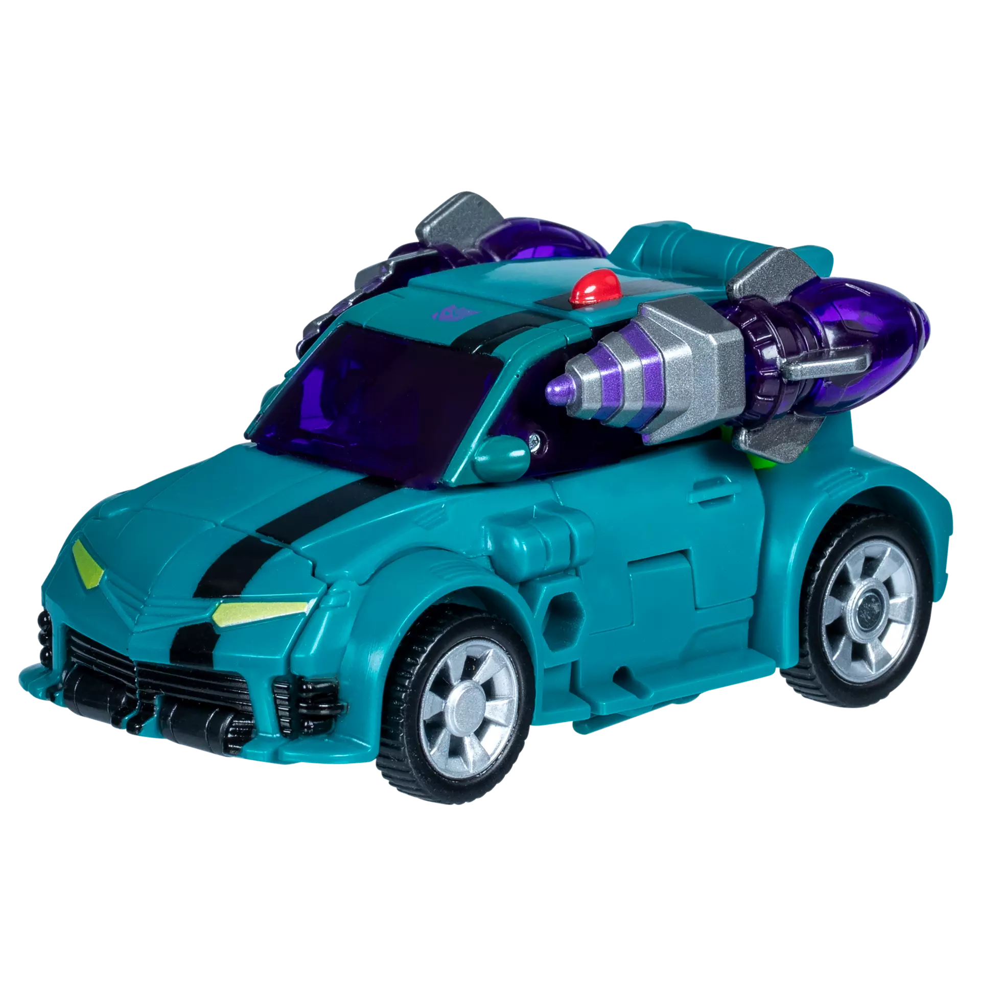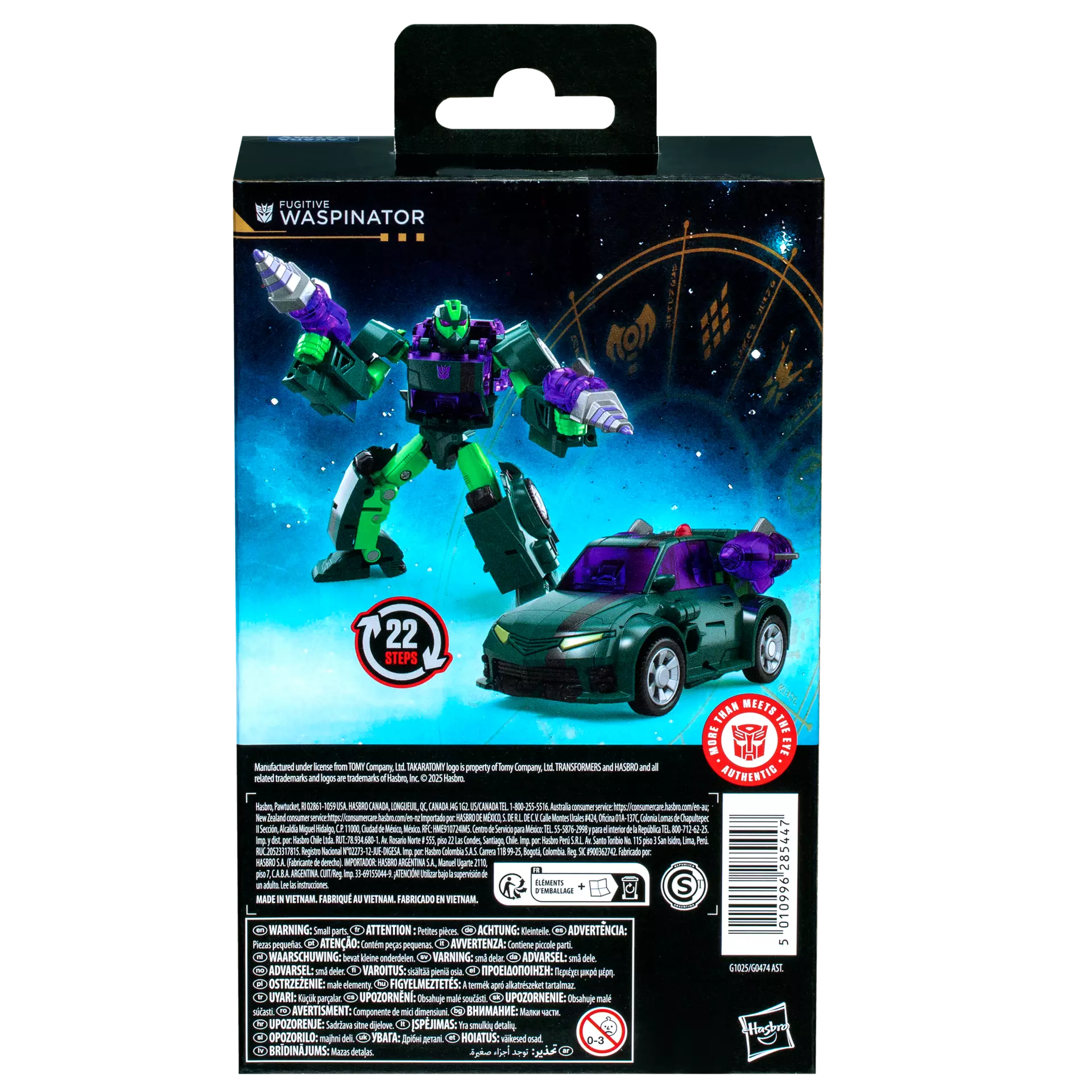 This 5.5-inch Fugitive Waspinator action figure converts between robot and sports car modes in 22 steps. Includes blaster accessories that attach to the figure. The Fugitive Waspinator figure is inspired by the character from the Transformers universe and features articulated head, arms, and legs for awesome action poses.