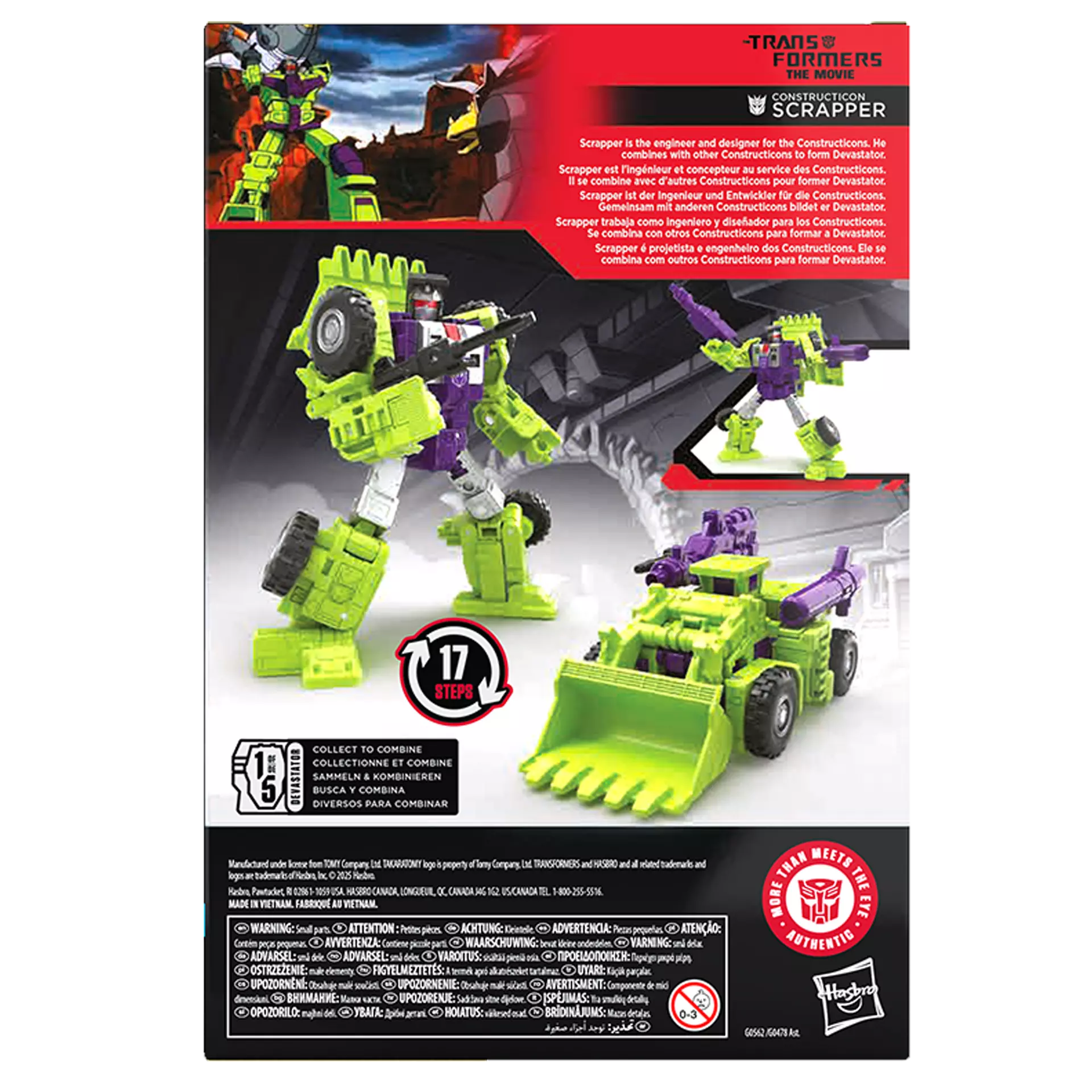 Combine the 6.5-inch (16.5 cm) Constructicon Scrapper figure with other Transformers Constructicon action figures to create the Devastator action figure! (Each sold separately, subject to availability.) Transformers Studio Series toys are collectible action figures that feature movie-inspired details and accessories. Convert the Studio Series Transformers action figure from robot to front-end loader mode in 17 steps. The figure has articulated head, arms, and legs for action poses.